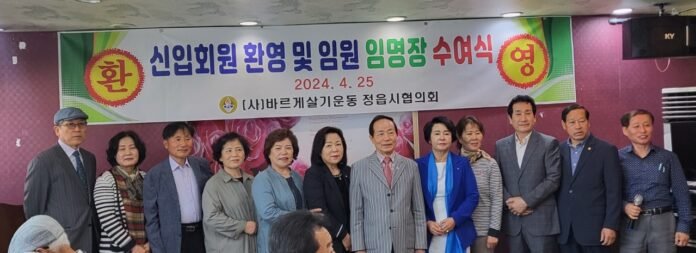 ‘바르게살기 운동 정읍시 협의회’ 최창묵 회장이 지난 4월 25일 정읍 옥돌회관에서 신입회원 환영 및 임원 임명장을 수여했다.