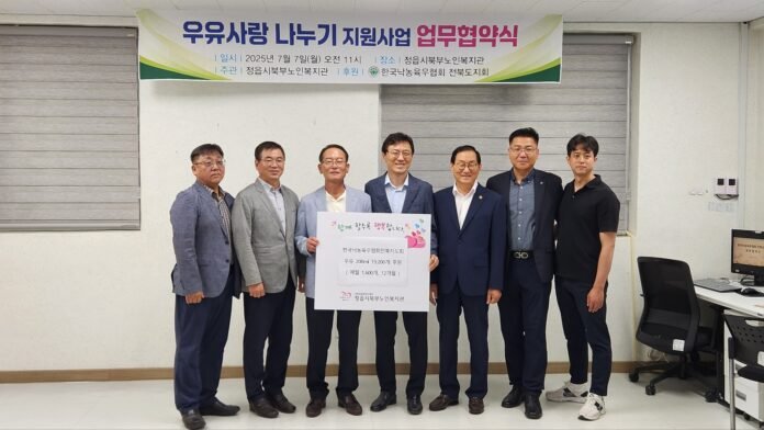 한국낙농육우협회 전북도지회가 7월 7일 정읍시북부노인복지관과 ‘우유사랑나누기’ 사업의 일환으로 후원 협약을 체결했다.