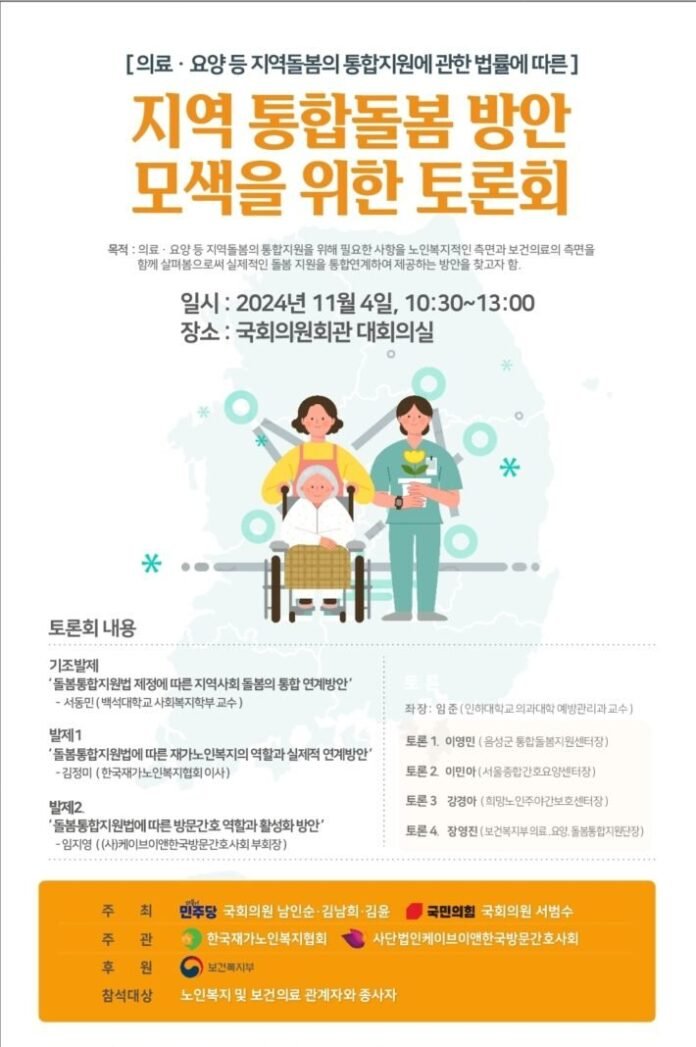 이번 행사는 남인순·김남희·김윤(이상 더불어민주당), 서범수(국민의힘) 국회의원이 주최하고, 한국재가노인복지협회와 사단법인 케이브이앤한국방문간호사회가 주관하며, 보건복지부가 후원한다. 노인복지와 보건의료 관계자와 종사자를 대상으로 진행되는 이번 토론회는 지역 돌봄 서비스의 효율적 연계를 통해 통합돌봄이 실제로 구현될 수 있는 방안을 마련코자 기획됐다.